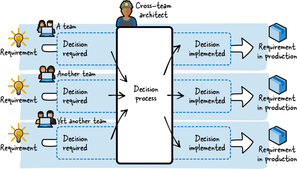 Both of these approaches, despite good intentions, often lead to teams waiting for architectural input, which hinders flow and can result in bad decisions within and across teams.